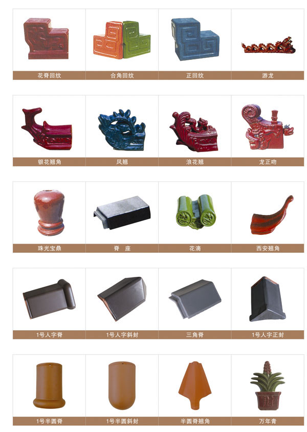 公司主要生產(chǎn)品種有:琉璃瓦系列、陶瓷瓦系列、石板瓦系列、平板瓦系列、西班牙瓦系列、S瓦系列、圓筒瓦系列、仿古瓦系列以及各類屋脊走獸、花窗欄桿等。宜興琉璃瓦質(zhì)地優(yōu)良,規(guī)格齊全,造型古樸典雅,釉色豐富多彩, 富有濃郁的民族特色。如西班牙瓦,S瓦,造型起伏多變,具有古典的南歐風(fēng)格,鋪蓋后自然高雅,格調(diào)獨(dú)特,適合西式風(fēng)格的建筑;圓筒瓦系列,造型簡樸平實(shí)。融合了東方文化的風(fēng)土色彩,鋪蓋后秀麗大方,輕盈淳樸,適合中國古典建筑。